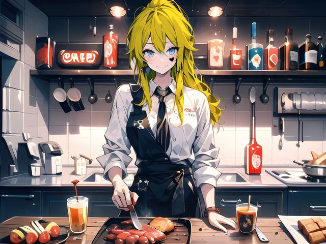 艾丽娅站在摇滚汉堡店的厨房里,背对着热腾腾的油烟和烤肉香味。她穿着一身简单的工作服,头发被绑成了一个高高的马尾辫,展现出她年轻活力的一面。她操纵着锅铲和刀具,熟练地进行着各种烹饪动作。