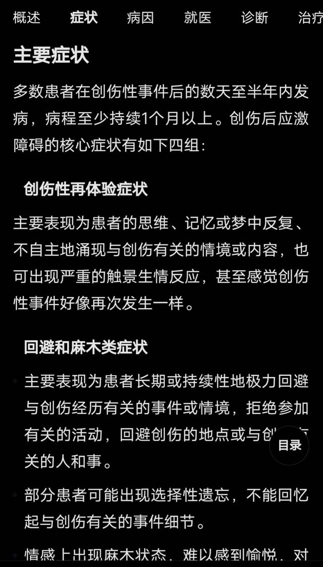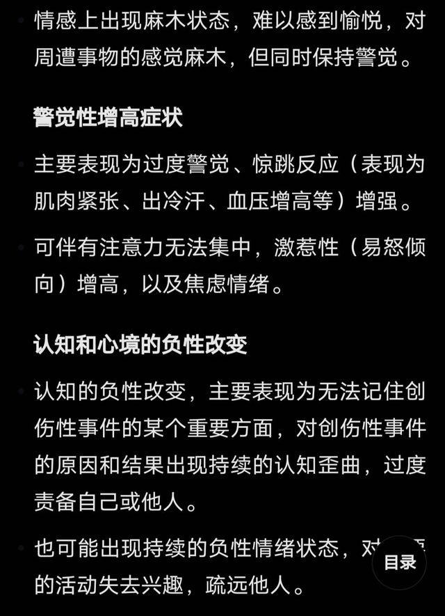 『目前病人有相对于严重的心理问题,创伤性再体验症状、回避麻木类症状、警觉增高症状、认知和心境的负性改变,这四个症状,也就是我们所说的创伤后应激障碍,目前没有明确的治疗方法,只能是你们慢慢疏导,还有她自己的调节了』