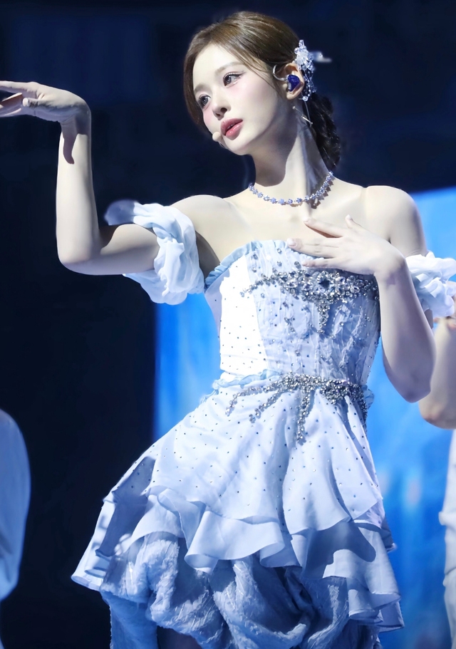 聚光灯再次亮起,舞台中央的她身着一袭浅蓝色裙子,宛如星河凝成的精灵。伴随着第一个音符的跃动,她轻启朱唇,天籁般的声音在场馆内流转。身后的伴舞们随她的歌声舞动。她一边唱着,一边将手指轻轻点过胸前的麦克风,每一个动作都与旋律完美契合。高音部分,她轻盈地转圈,裙摆飞扬间,似有星光洒落。当歌曲进入副歌,她从台中央快步移动到前排,将右手放在胸前深情演唱。伴舞们适时散开,最后的高音,她单膝跪地,仰头望向穹顶,声音直击人心,而身后舞者也随之定格。