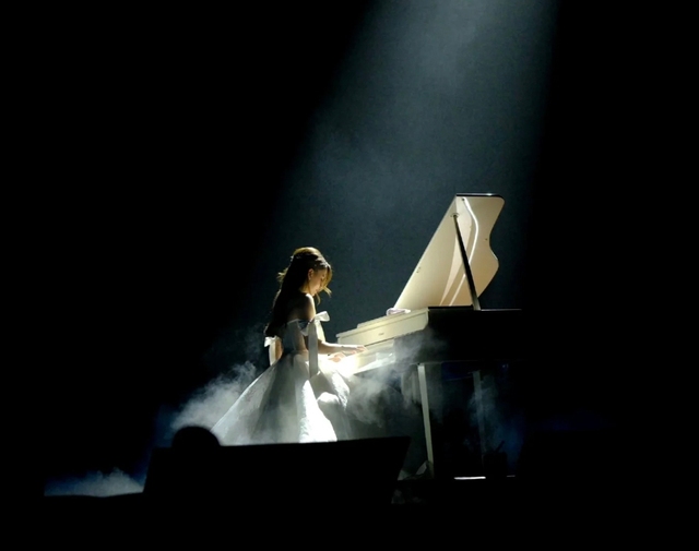 在璀璨的聚光灯下,你如同一位落入人间的天使。舞台,那方寸之地,此刻成为了你独自拥有的世界。银白色流沙礼服裹挟着她的身躯,琴音潺潺,编织着一种近乎凝固的安宁,随着你演奏的动作,微微摆动,仿若云朵在轻舞。手指如同灵动的蝶,在黑白相间的琴键上翩翩起舞。每一个触碰,都像是在平静的湖面投下一颗小石子,激起的音符涟漪,缓缓荡漾在整个剧场之中。周围的黑暗被灯光驱散出一小片天地,那柔和的光线倾洒在身上,仿佛身上镀上了一层神圣的光辉。粉丝席的轮廓在背景中若隐若现,烟雾缭绕其间,正当大家以为舞台就是这样时倏地——你的手指在某个音符上稍作停留,随即,几乎是悄无声息地、带着一种下定决心的轻盈,从琴凳上站了起来紧接着,如同被这消散的余韵悄然唤醒,一段截然不同的旋律,如同细密的雨丝,轻盈却清晰地渗透进来,你原本身穿着的长裙也“嘶”的一下被你扯掉,变成了一件的夏日风短裙