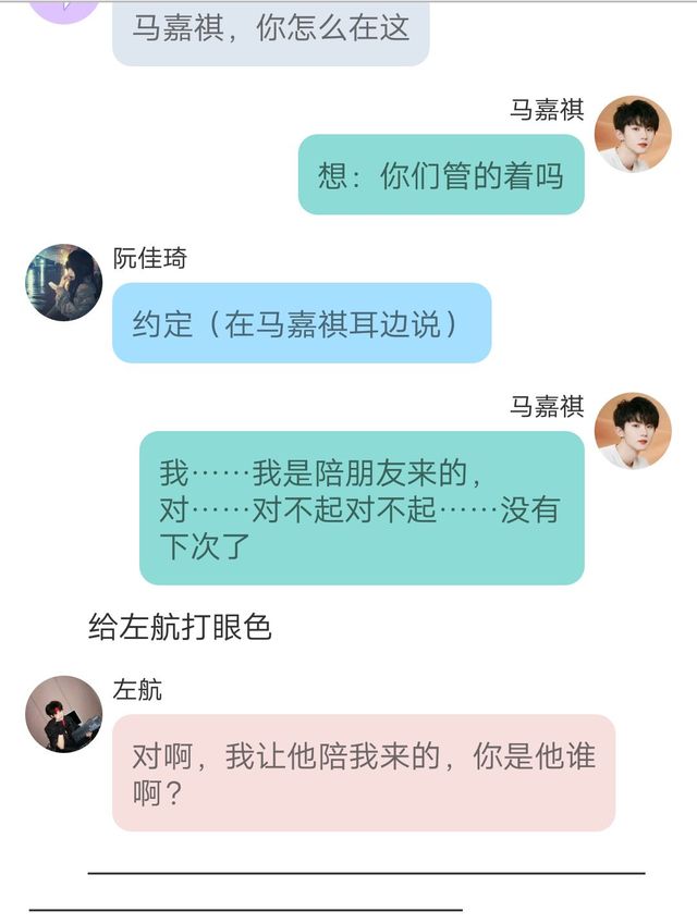 所有人(妈――的,真酸!凭什么那个毛头小子“左航”能让马嘉祺陪他来酒吧)