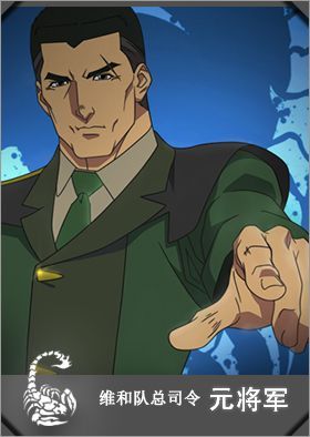 元将军,是维和队总司令。维和队总司令。受委派指挥代号为 Secret Intelligent [Z] Equipment 的秘密计划,简称"SIZE计划"。并获准使用国家研究已久的机械装甲 ——御武甲。深知维和队背负的重大使命和面临各种未知的困难,所以对他们要求异常严苛。冷静、果断、目光独到、沉默寡言、善于思考、不怒而威,精于洞悉战情、把握战机。 前国防部部长,军功显赫,曾保持军校枪械成绩三十年。