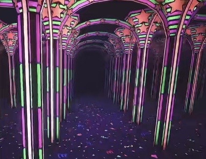 在冒着五颜六色的灯光的走廊走着