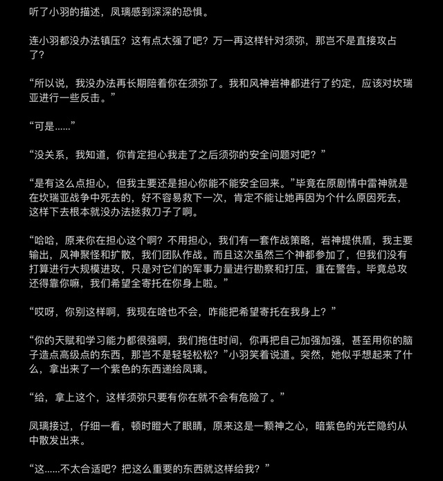 “哈哈,原来你在担心这个啊?不用担心,我们有一套作战策略,岩神提供盾,我主要输出,风神聚怪和扩散,我们团队作战。而且这次虽然三个神都参加了,但我们没有打算进行大规模进攻,只是对它们的军事力量进行勘察和打压,重在警告。毕竟总攻还得靠你嘛,我们希望全寄托在你身上啦。”