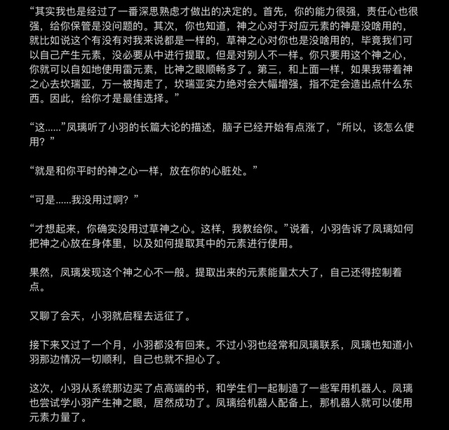 这次,小羽从系统那边买了点高端的书,和学生们一起制造了一些军用机器人。凤璃也尝试学小羽产生神之眼,居然成功了。凤璃给机器人配备上,那机器人就可以使用元素力量了。