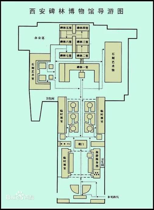 “碑林始于唐朝,是在古碑林的基础上,利用西安孔庙古建筑群扩建而成。由孔庙、碑林、石刻艺术室三部分组成。照壁、牌坊、泮池、棂星门、华表、戟门、碑亭、二庑等明清建筑保存至今,并遵循着孔庙固有的建筑格局,组成了一个绿树掩映、古朴典雅的庭院式建筑群。”