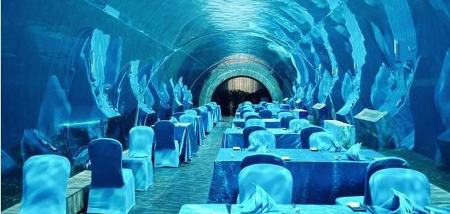一家海洋馆主题餐厅,一进餐厅,他们就仿佛置身于海底世界。