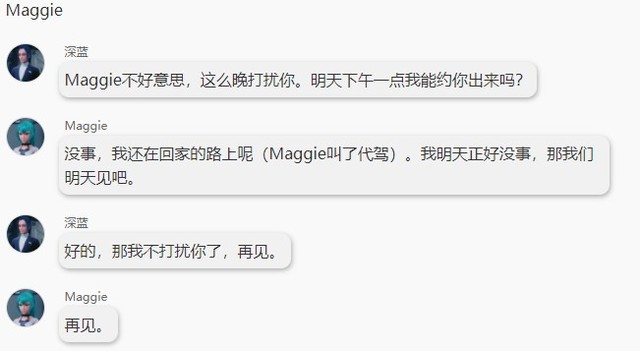 晚上,深蓝回到家后给Maggie发了条消息,聊天记录如下。