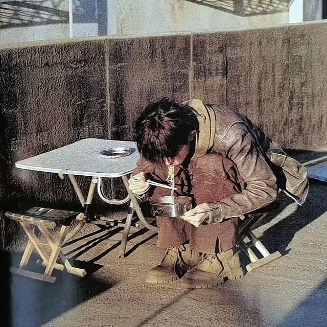 可怜的一一和爸爸,大冬天两人一人端一碗饭去外面吃