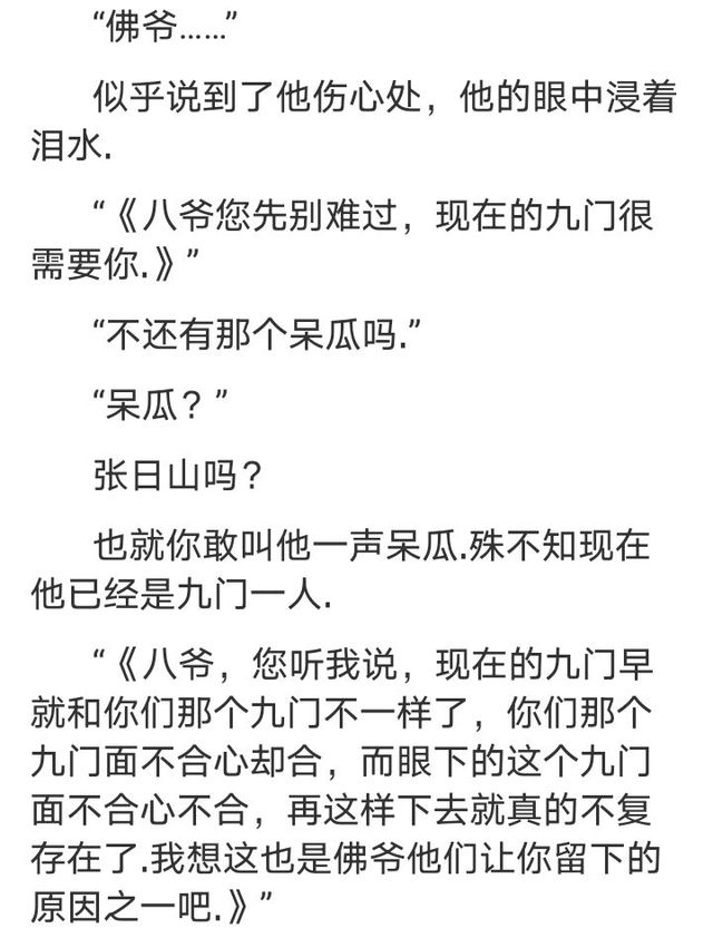 “《八爷你就别管我哪来的了,反正我们的目的一样,都是为了帮吴小三爷清洗掉汪家换掉现在的九门.》”