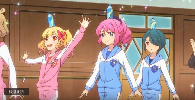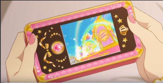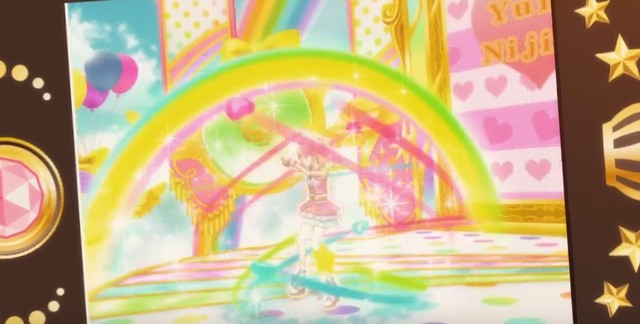 虹野梦放好学生证,再把服装卡片逐一放上去穿过大门到达舞台
