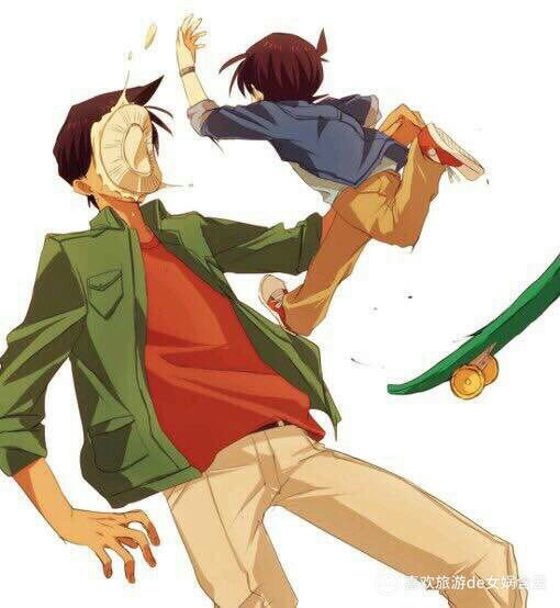 生气的柯南用他的滑板一蹦三尺高还给基德一脸蛋糕