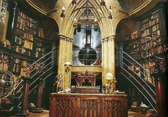 艾莉娅把门推开:门后是一个宽敞、美丽的圆形房间,细长腿的桌子上放着许多稀奇古怪的银器,旋转着,喷出一小股一小股的烟雾。墙上挂满了昔日男女老校长的肖像。