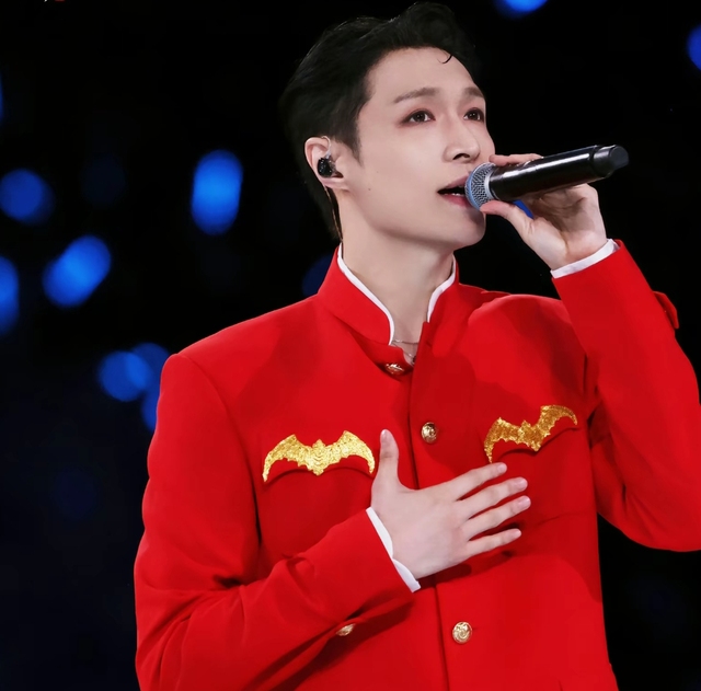 他身着一套新中式红色立领中山装,灯光洒落,红色缎面上泛起温润的光泽,似有流霞轻舞。