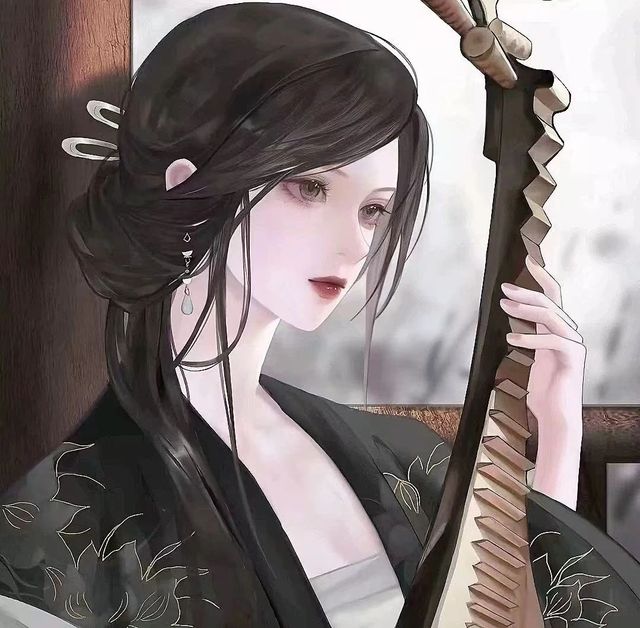 一黑衣女子抱着琵琶依在柱子上,手上还不断拨弄着琴弦。