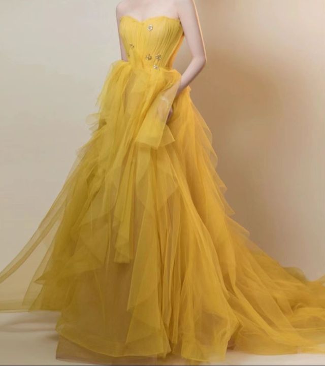 穿上淡黄色的抹胸礼服再加上造型师和化妆师的稍微加持,任然看上去像迪士尼的贝儿公主