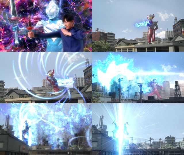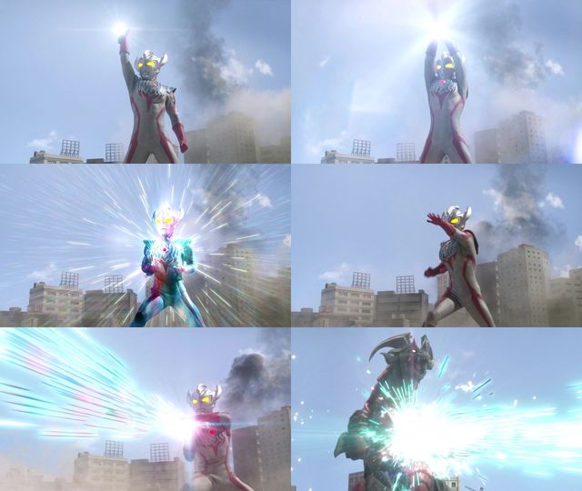 泰迦与新生代(左手出现彩虹能量直接向贝利亚打去)