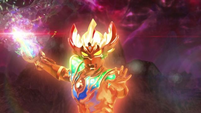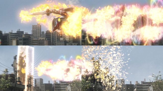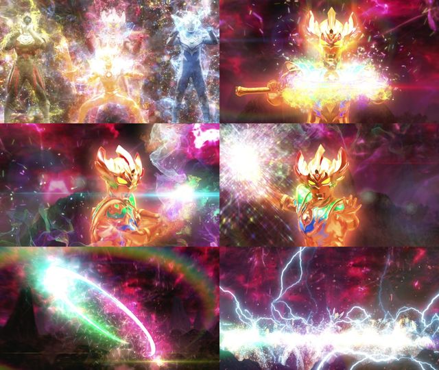 泰迦.彩虹斯特利姆彩虹泰迦爆冲击!(身体与泰迦三重剑共同缠绕彩色的高热火焰后,手持剑向托雷基亚突进,刺穿托雷基亚同时产生大爆炸)