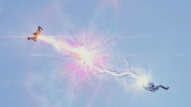 泰迦与新生代(在腿部汇聚彩虹能量,发出彩色光芒与贝利亚的帝斯修姆光线碰撞)
