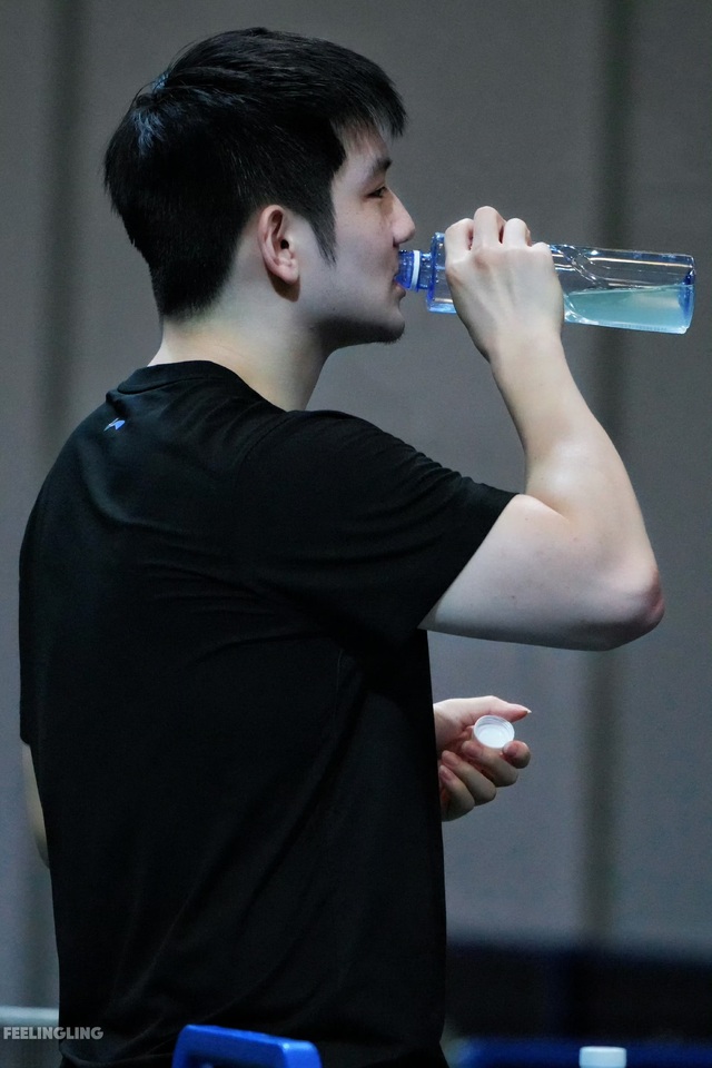 樊振东喝完水后,继续恢复训练.