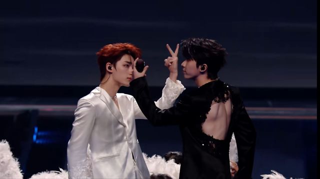 马嘉祺因为我们最后需要往后倒嘛,以前是带是以为取消了这个环节,所以有这个能起到一个装饰的作用,能好看点,但最后导演组提供了这么一个道具(指了指身后的楼梯),所以就加上了最后这个向后倒的舞台,如果加上翅膀的话容易打到在下面扶着海绵垫的工作人员,也容易搁伤我们自己,所以就拆掉了,但拆掉后的服装效果也是很不错的,所以就没有带