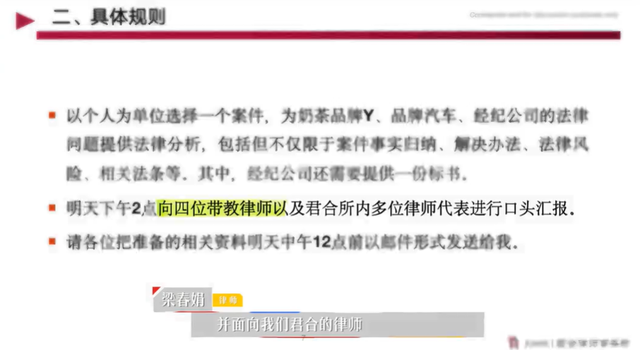 这次的课题是面向君合内部律师的一个汇报,有三个案件可选,分别是知名奶茶品牌的反垄断纠纷、品牌汽车侵权销售拒付纠纷和品牌首饰艺人代言合同纠纷,其中最后一个还需要附带一份法律顾问的竞标书。