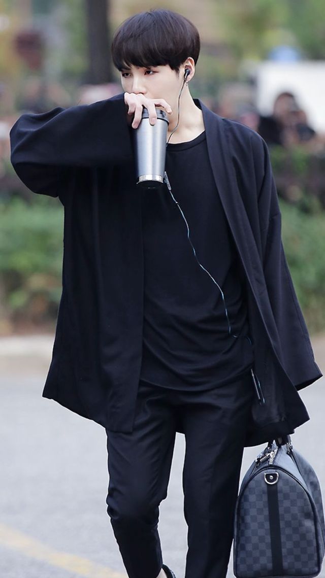 紧跟其后是身着一身黑衣服,黑行李箱,的闵玧其。