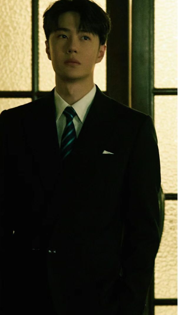 男人穿着一身黑色西装,站在灯下