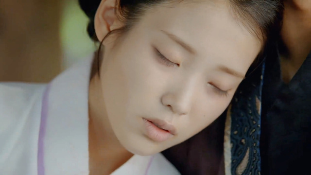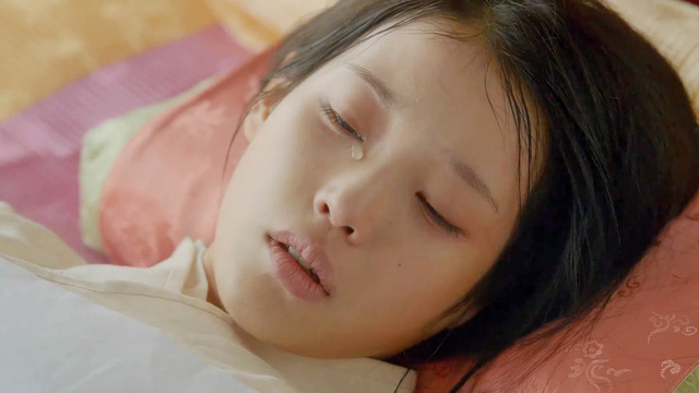 小夭的头抵着解树的头,一颗眼泪顺着面颊滑下,恰滴落在解树眼角,欲坠未坠,倒好似解树眼中滴下的泪。