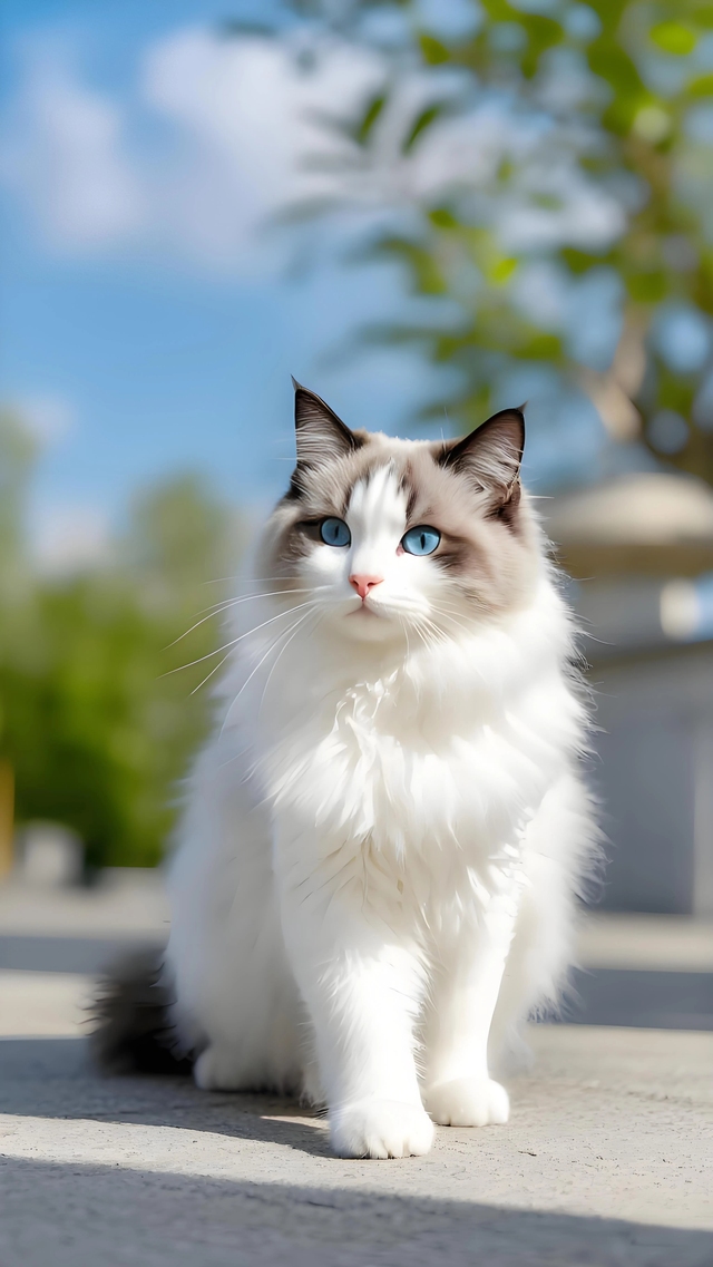 一只可爱的小猫咪慵懒的趴在树枝交叉处,身上雪白的绒毛洁白如雪,有着一双如天空蔚蓝的瞳眸,瞳眸周围连同额头耳朵微微渐变灰色,渐变成黑色的耳尖微微抖动,慵懒中透露着人性化的高贵。
