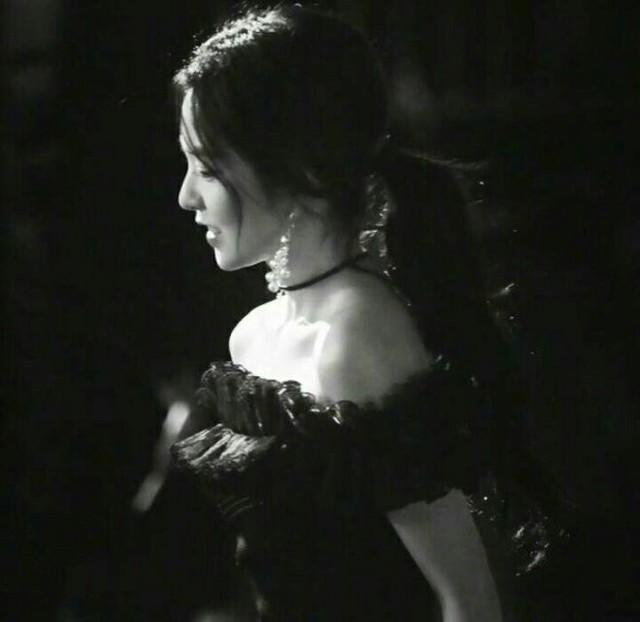 一身黑色的雪纺裙,一字肩的设计完美凹显了少女雪白的肌肤和动人的锁骨,脖子上的choker更显妖治。