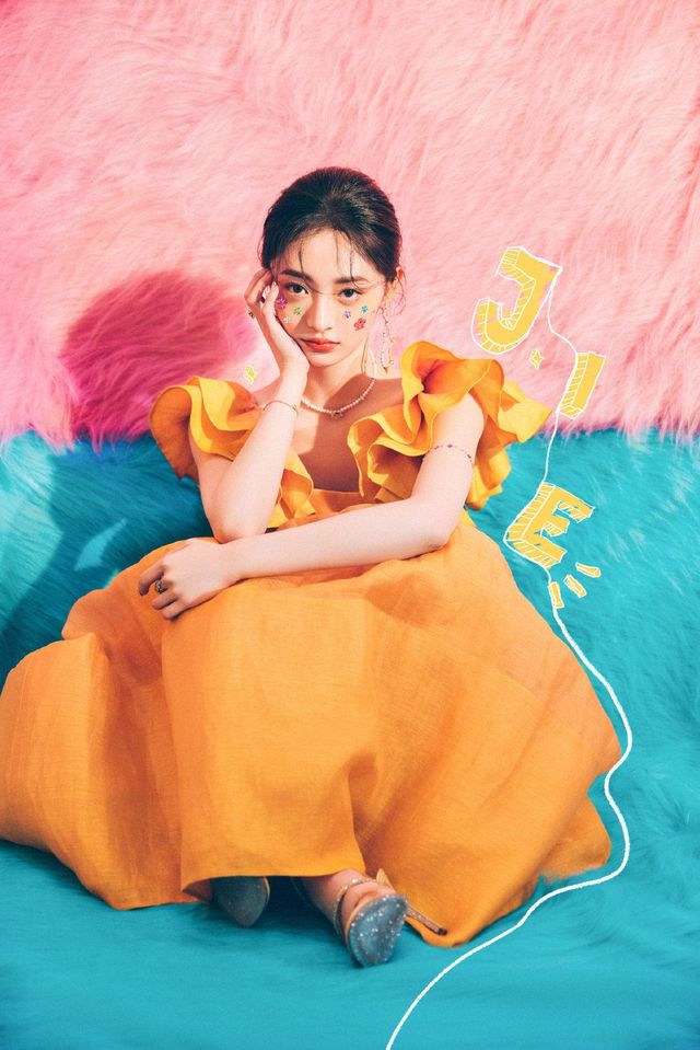 图片上的姜愿安坐在地上,地上铺着一半蓝色一半粉色的绒毛,她身穿深黄色的裙子,裙子把腿全部盖住,头发盘了起来,脸上还贴着亮晶晶的贴画,一只手托住脸颊,另一只手放在腿上。
