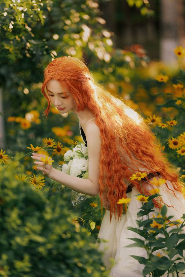 俨然就如一个精灵一样,橙色的长发及腰,背景是很多小黄花和绿叶,姜愿安手里拿着一束白色的花,低下头弯腰手里还拿着一朵刚刚摘下来的小黄花。