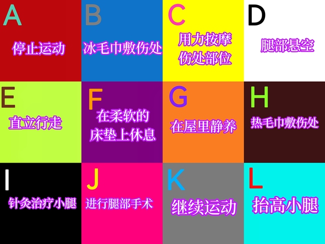 正确答案是:C用力按摩伤处部位,E直立行走,F在柔软的床垫上休息,H热毛巾敷伤处,K继续运动