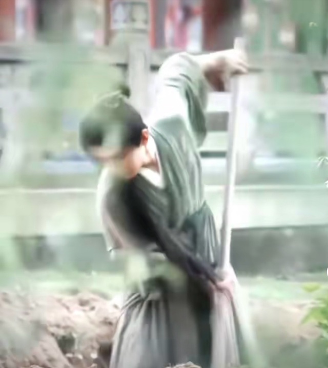 李莲花卷着裤腿、挽着袖子在菜地里翻地、松土。