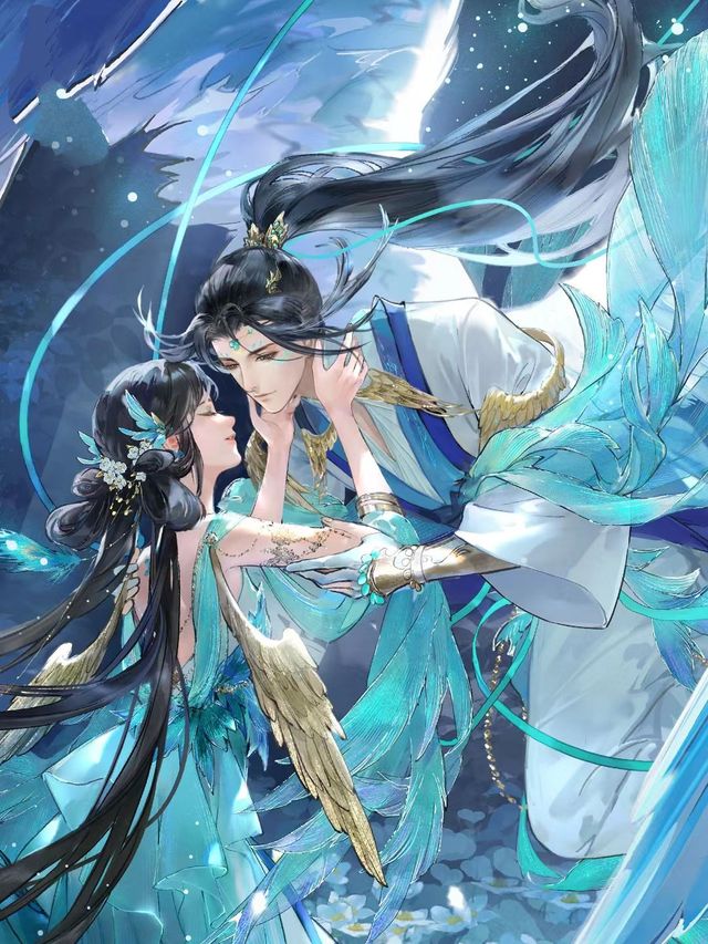 蓝衣郎君飘在空中,扑向姑娘,蓝衣姑娘微微浮起,二人互相伸手努力够着对方,眸光胶着在一起。