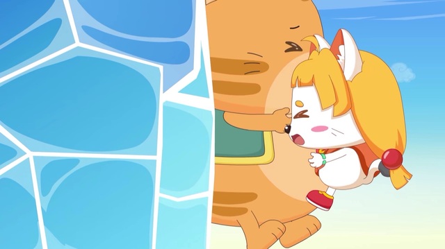 喜羊羊很快躲过了懒羊羊的攻击,皓月使出奇力结果灰太狼、懒羊羊、皓月、福来依次被甩飞的冰墙上