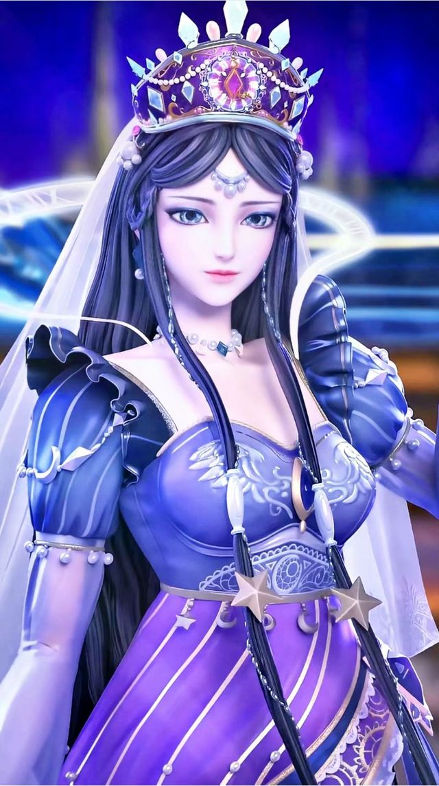 银灰色长直发披散开来,半透明的轻纱披在脑后,头戴镶嵌各色菱钻的紫色冕冠,眉心坠着圆润光泽的珍珠额饰,双眸仿若容纳无数繁星的银河一般璀璨,眼影细闪银紫,如静影沉璧。
