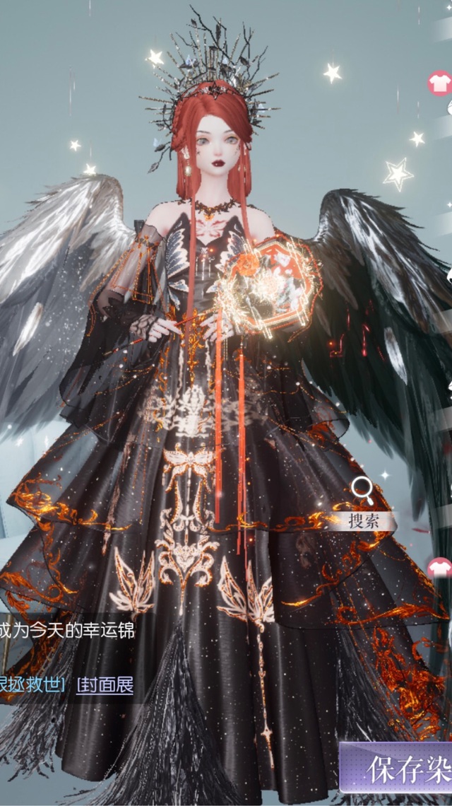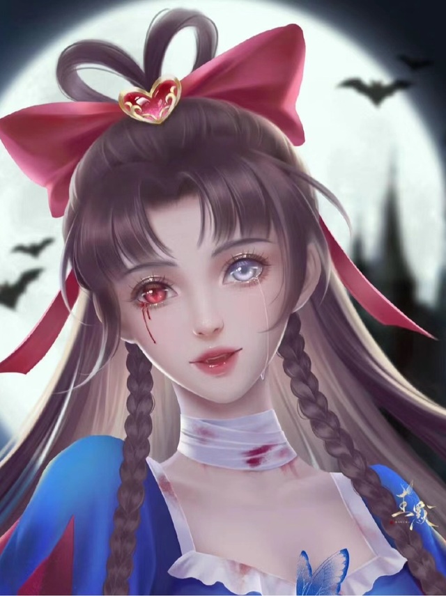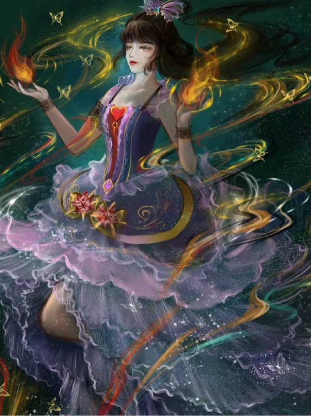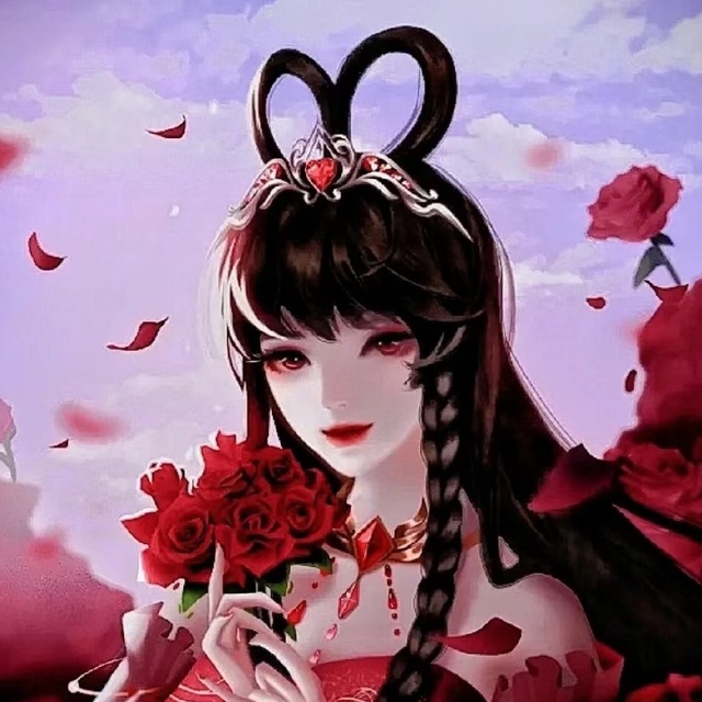 她穿着一件暗红色的长裙,裙摆散发着流苏的光芒,腰间系着一条黑色的腰带,手持一把暗红的弓箭,散发着神秘与神圣的气息