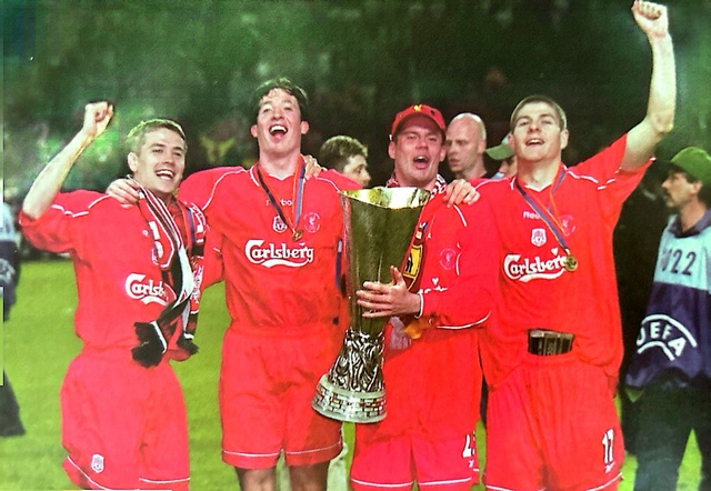 2000到2001赛季在夺得联盟杯之后,欧文与福勒卡拉格和杰拉德共同捧杯庆祝四人是利物浦青训营的师兄弟。