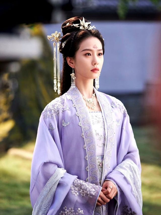 女子一袭紫色长裙拖地,繁复的裙摆摇曳生姿