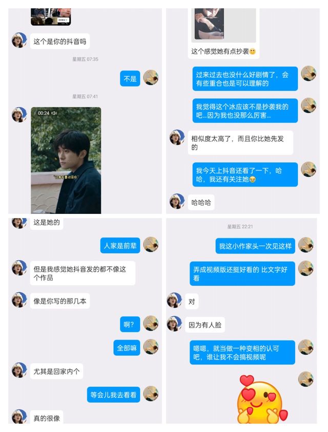 在看到她的作品时我更加惶恐,她发布了【不要抄袭】字样的视频,是不是她的粉丝也看到了我的作品呢?被贼喊捉贼的感觉很不好受。😑