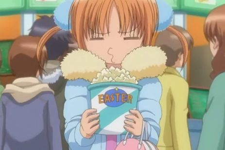 弥耶不满的嘟嘟嘴,但亚梦注意到的是爆米花桶上的字幕。