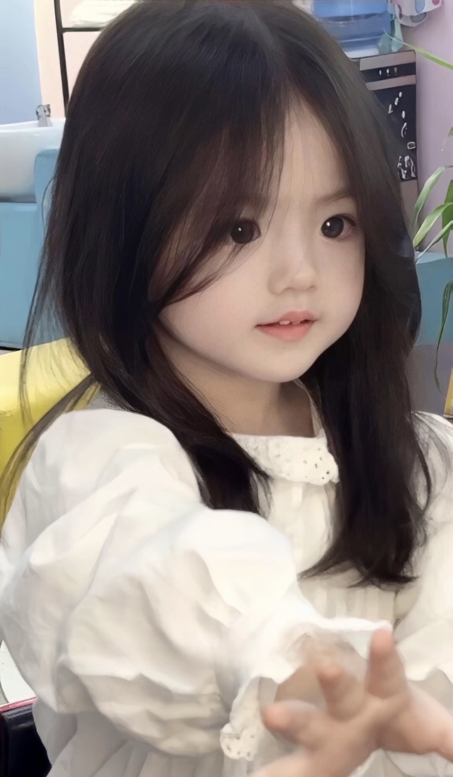站在凳子上的人儿宛如一幅细腻的工笔画,约莫三五岁的光景。她的乌黑秀发如丝般顺滑,齐肩的长度被精心梳理,几缕发丝轻拂过白皙的颈项,那儿点缀着一件蕾丝花边的小领口,隐约可见于她纯白的衣衫之下。那双明亮如湖水的大眼睛,清澈而深邃,配上淡雅的眉毛和柔和的肤色,形成一种宁静的和谐。她的表情恬静而微妙,嘴唇微启,仿佛正诉说着无邪的秘密,或是轻轻绽放着初夏的微笑。少年们不觉脸颊泛红