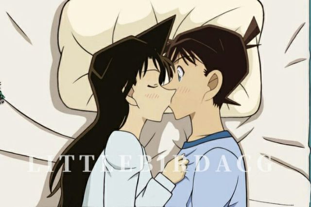 小兰平躺在床上,新一双手撑在小兰肩两边