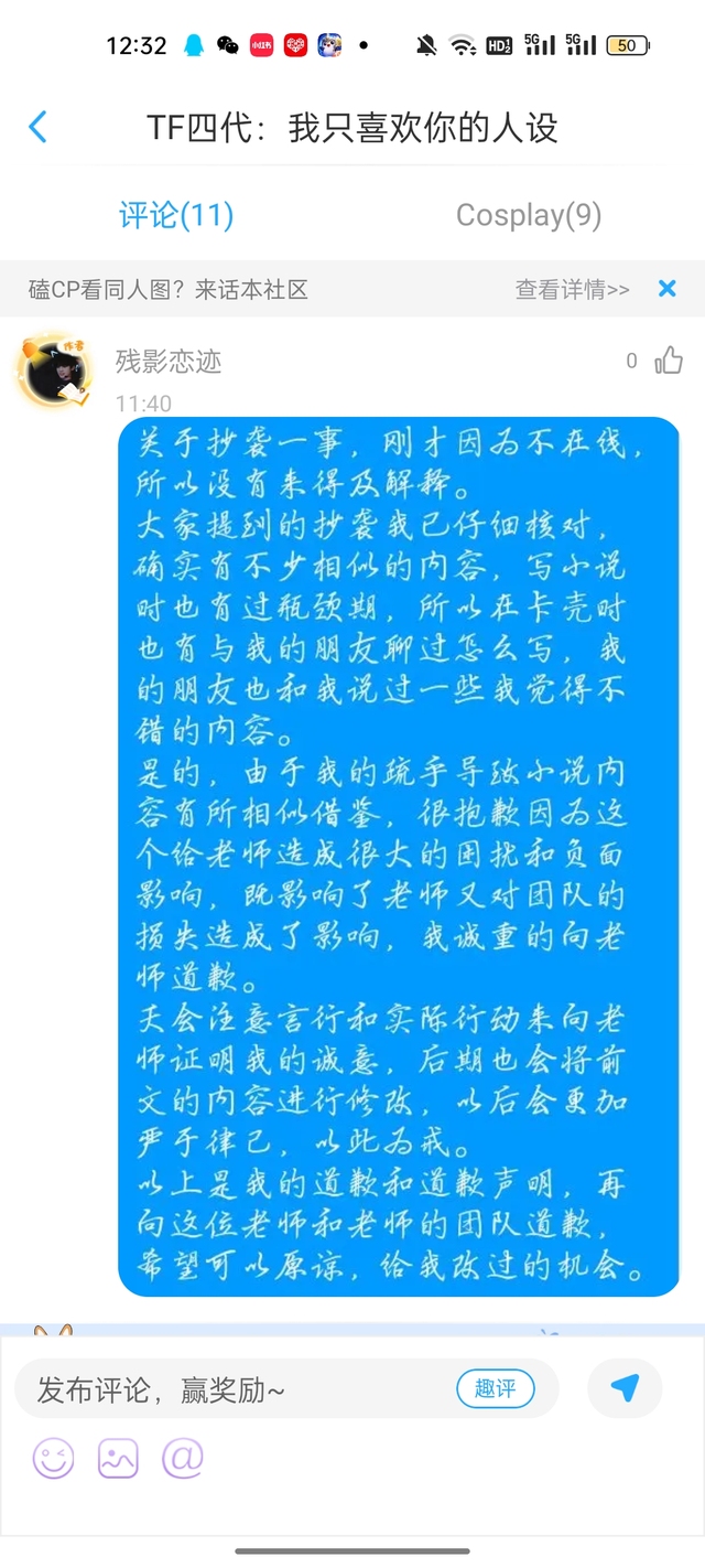 首先最近一个月我都在高考复习阶段,所以没有什么时间更新,所以也不知道最近发生了什么。直到昨天中午,我拿到手机的时候,想要打开话本看看最近有没有读者留言,结果一打开,就看到一个读者给我留言了一条关于抄袭的评论。