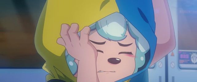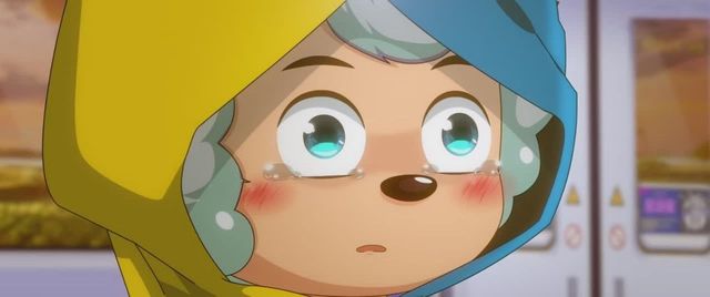 刚刚下了一场雨,蓁蓁和喜羊羊没带伞,现在帽子上还有雨水在往下滑落。