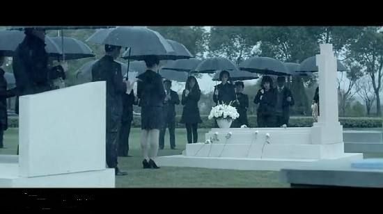 天空阴沉沉的,一堆举着雨伞的男女,安静地穿着端正的黑色西装。