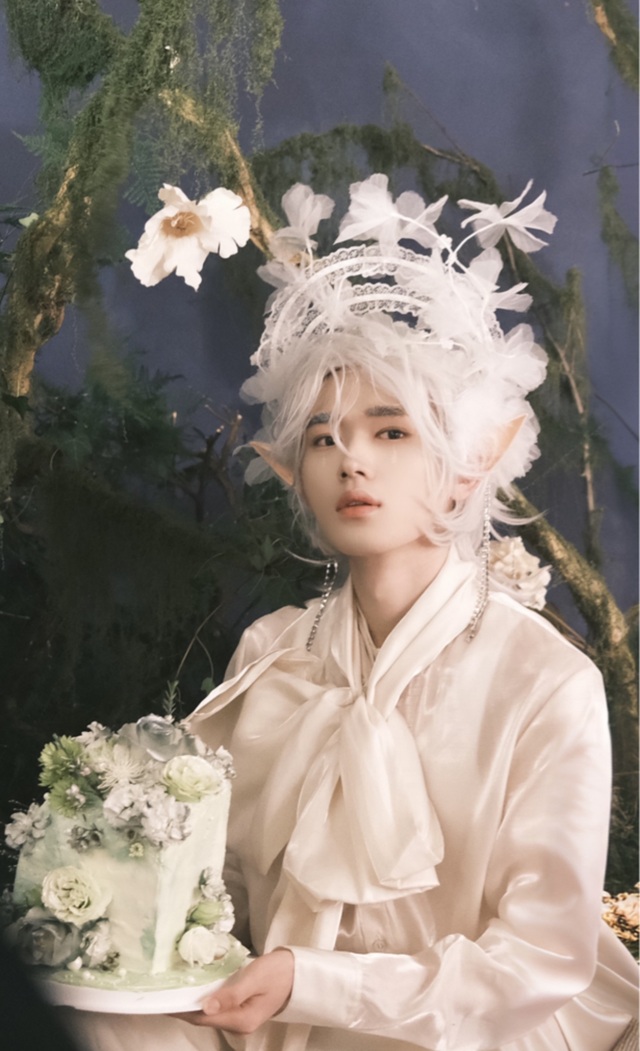 宋亚轩穿着一袭白衣,不知是不是染的白发,头顶上还戴着同色系的花冠,耳朵也是尖尖的。