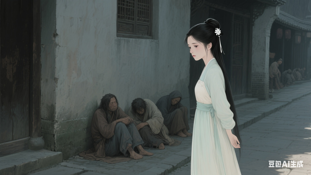 于溪棠的指尖猛地攥紧了车帘,指节泛白。她虽知民间不易,却从未见过如此触目惊心的景象。她下意识地摸出腰间绣囊,里面是临行前备好的碎银。